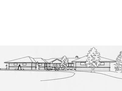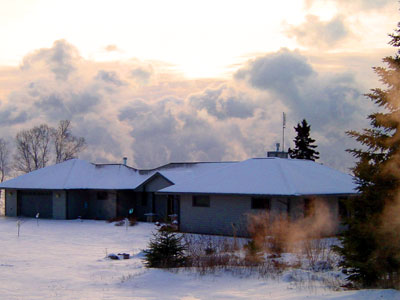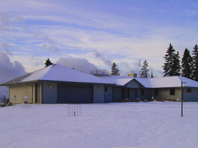 A long single-story slab house was designed to allow all the rooms of the house to take advantage of the Lake Superior view of Five Mile Rock. It is a very open plan with a Prairie Style appearance including hip roofs and large overhangs. It is set on a high bluff above the shore with great panoramic view of the lake.